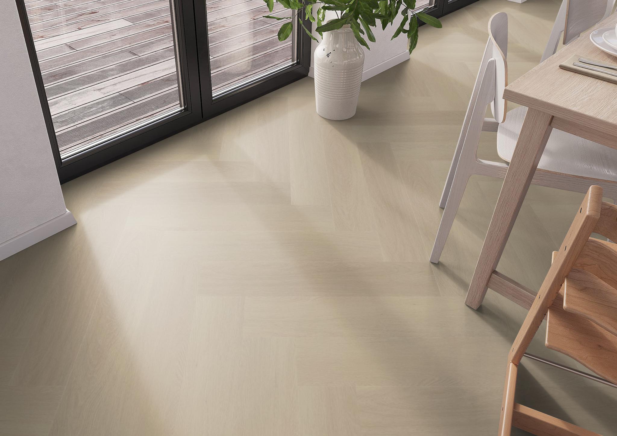 De moderne uitstraling van visgraat-pvc in karakteristieke uitvoering. Deze vloer is nauwelijks van echt hout te onderscheiden, door de kleine noesten. Deze vloer is 7 mm dik en heeft een toplaag van 0.55mm. deze vloer is ook geschikt voor appartementen vanwege 10dB deltaL in geluidsreductie.