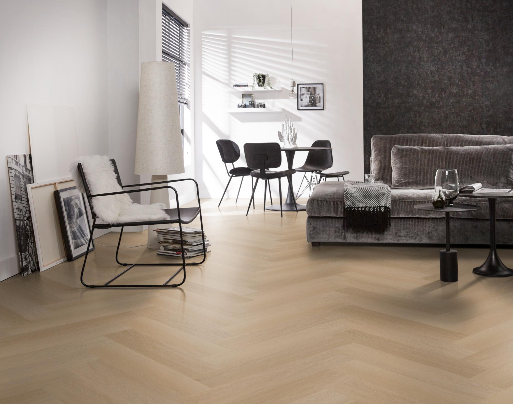 De moderne uitstraling van visgraat-pvc in karakteristieke uitvoering. Deze vloer is nauwelijks van echt hout te onderscheiden, door de kleine noesten. Deze vloer is 7 mm dik en heeft een toplaag van 0.55mm. deze vloer is ook geschikt voor appartementen vanwege 10dB deltaL in geluidsreductie.