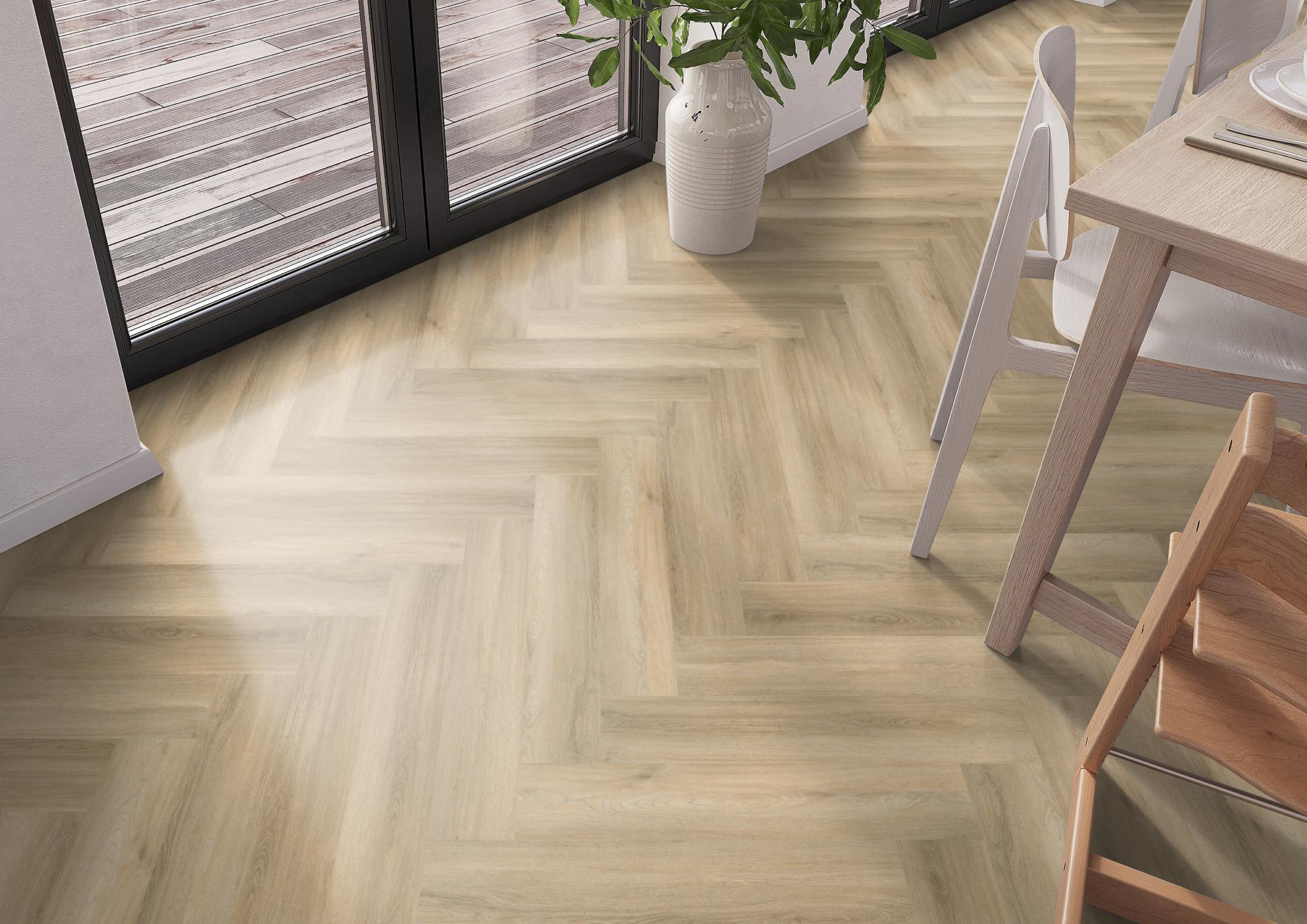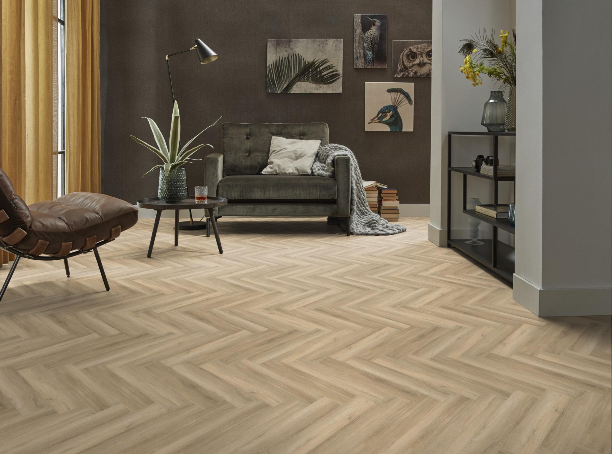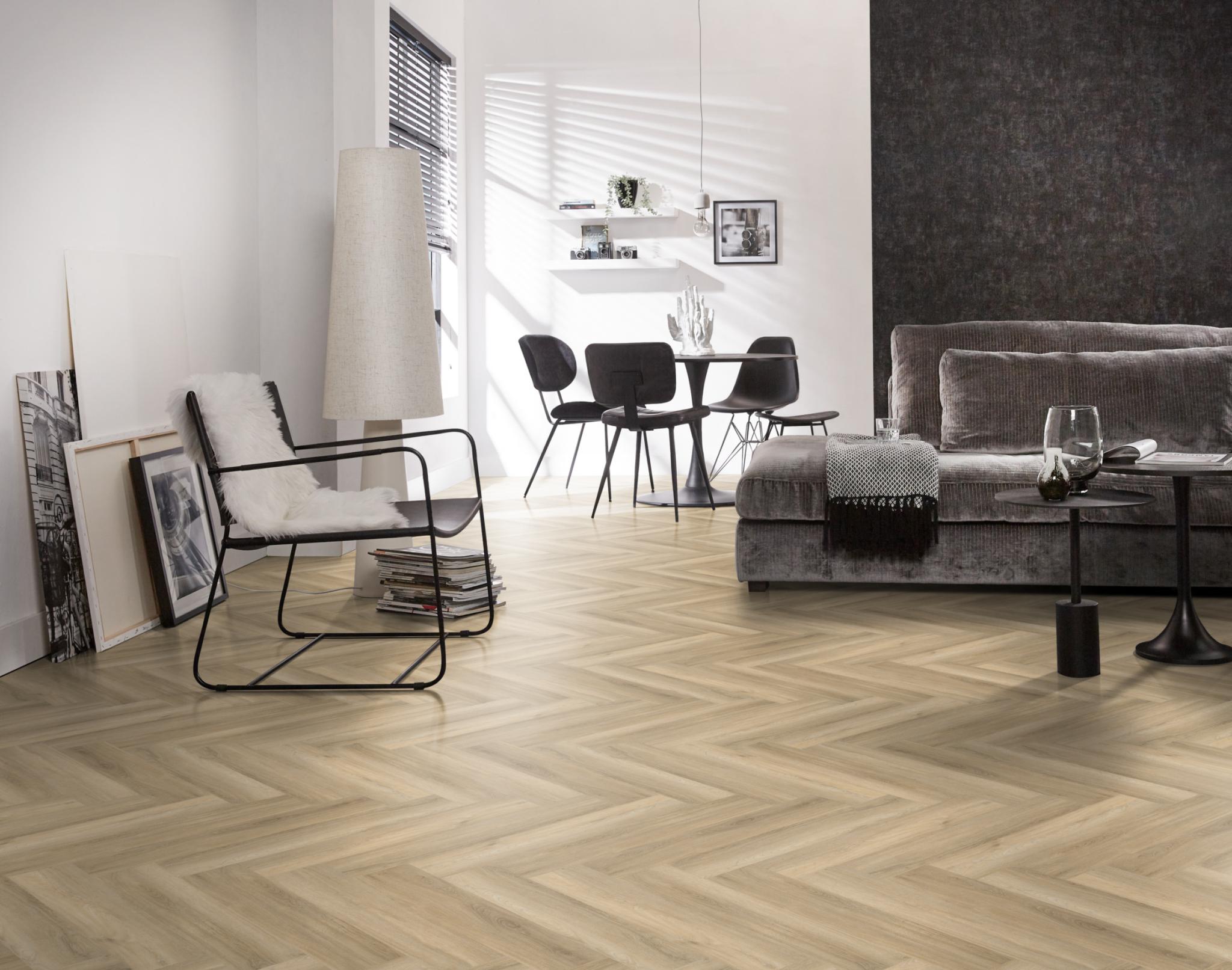 De moderne uitstraling van visgraat-pvc in karakteristieke uitvoering. Deze vloer is nauwelijks van echt hout te onderscheiden, door de kleine noesten. Deze vloer is 7 mm dik en heeft een toplaag van 0.55mm. deze vloer is ook geschikt voor appartementen vanwege 10dB deltaL in geluidsreductie.