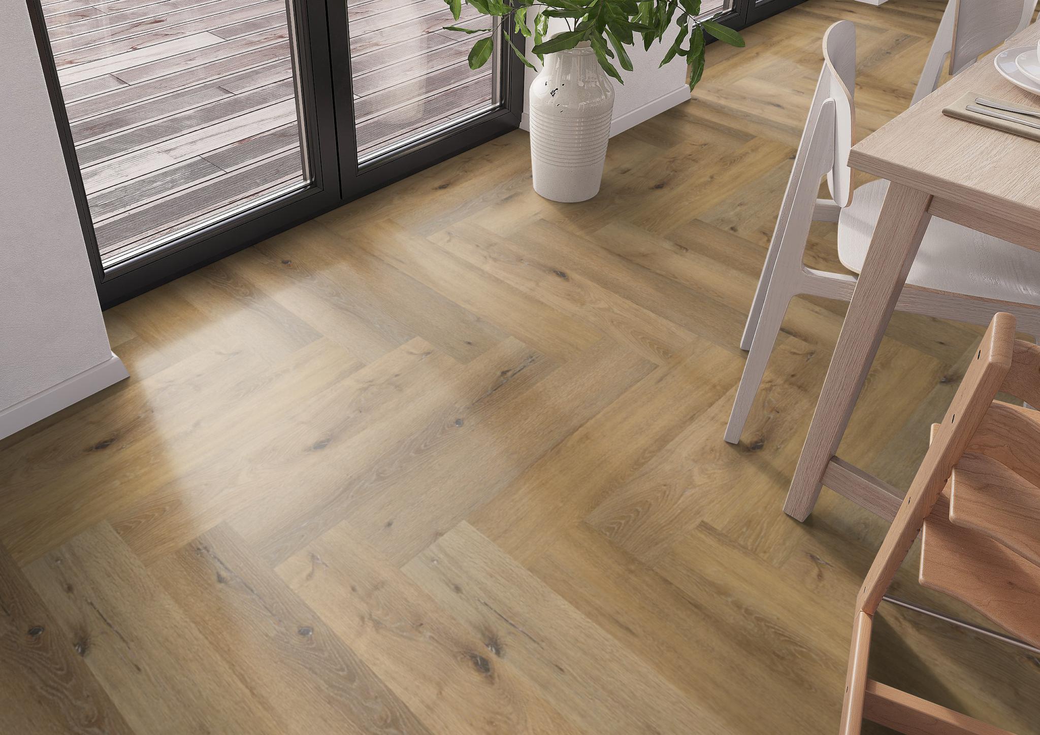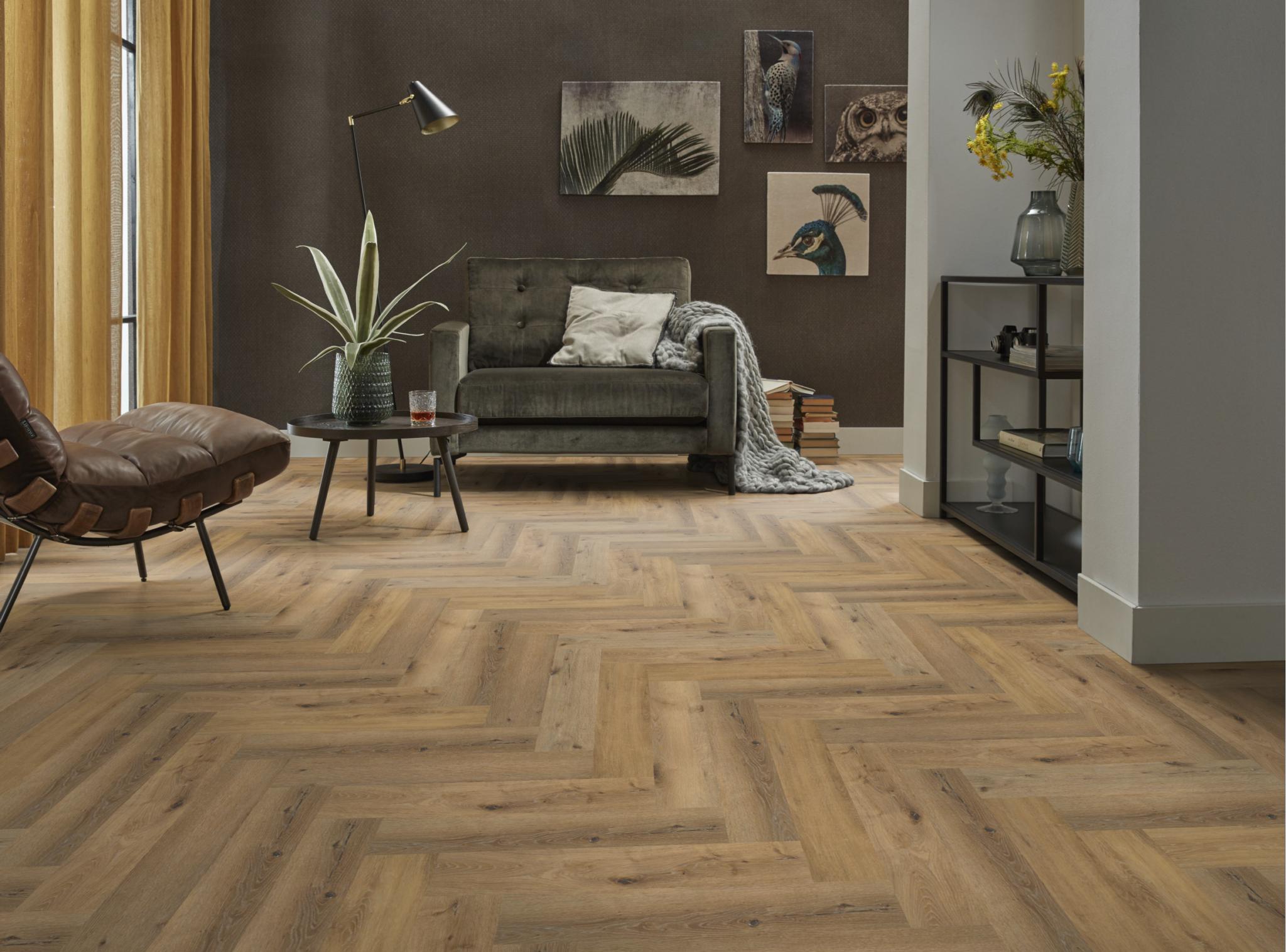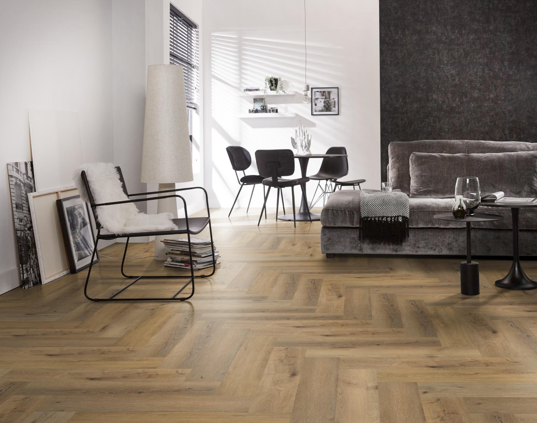 De moderne uitstraling van visgraat-pvc in karakteristieke uitvoering. Deze vloer is nauwelijks van echt hout te onderscheiden, door de kleine noesten. Deze vloer is 7 mm dik en heeft een toplaag van 0.55mm. deze vloer is ook geschikt voor appartementen vanwege 10dB deltaL in geluidsreductie.