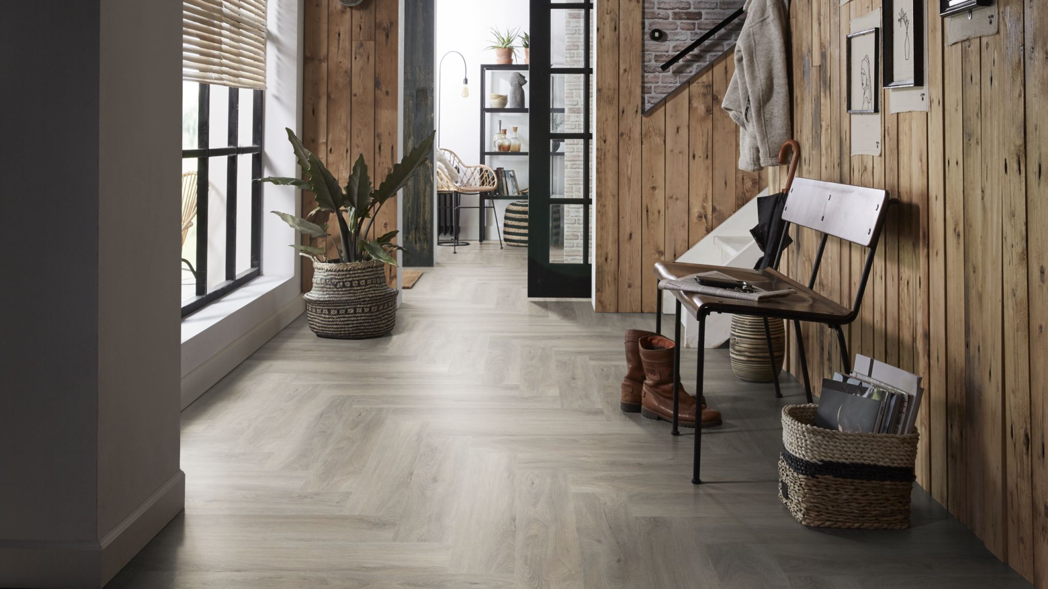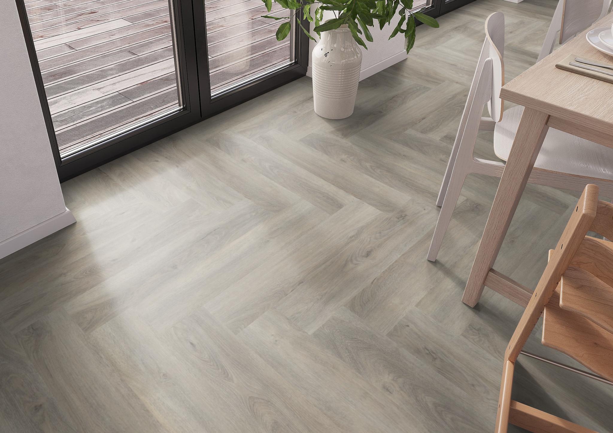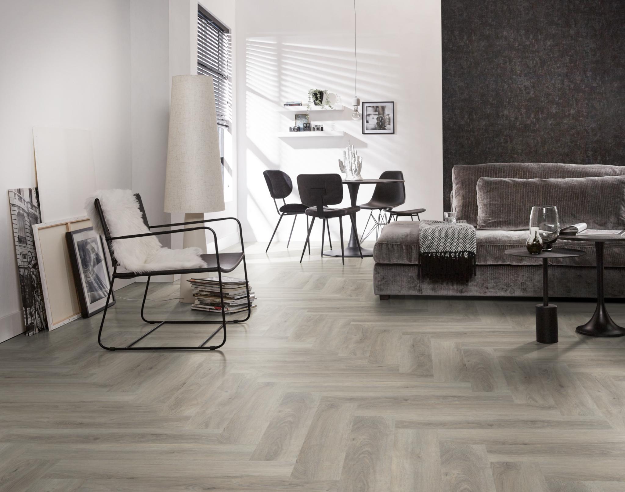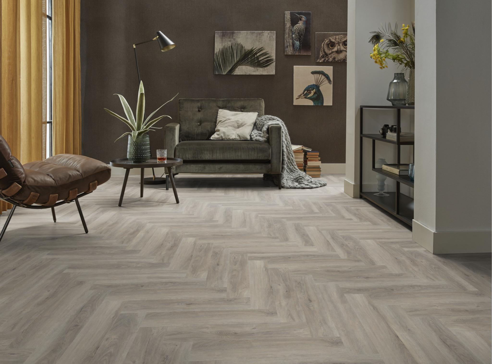 De moderne uitstraling van visgraat-pvc in karakteristieke uitvoering. Deze vloer is nauwelijks van echt hout te onderscheiden, door de kleine noesten. Deze vloer is 2,5mm dik en heeft een toplaag van 0.55mm.