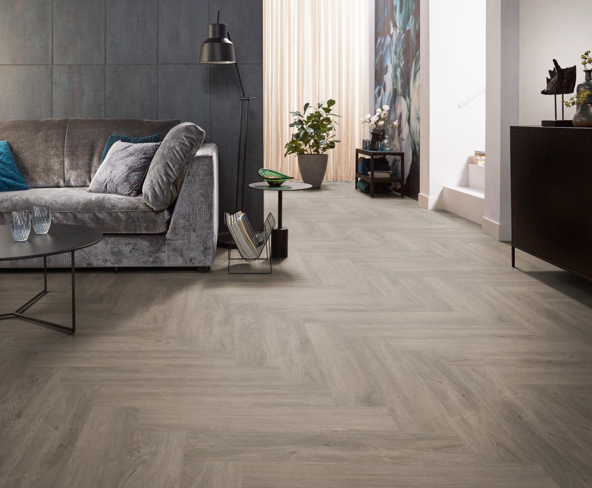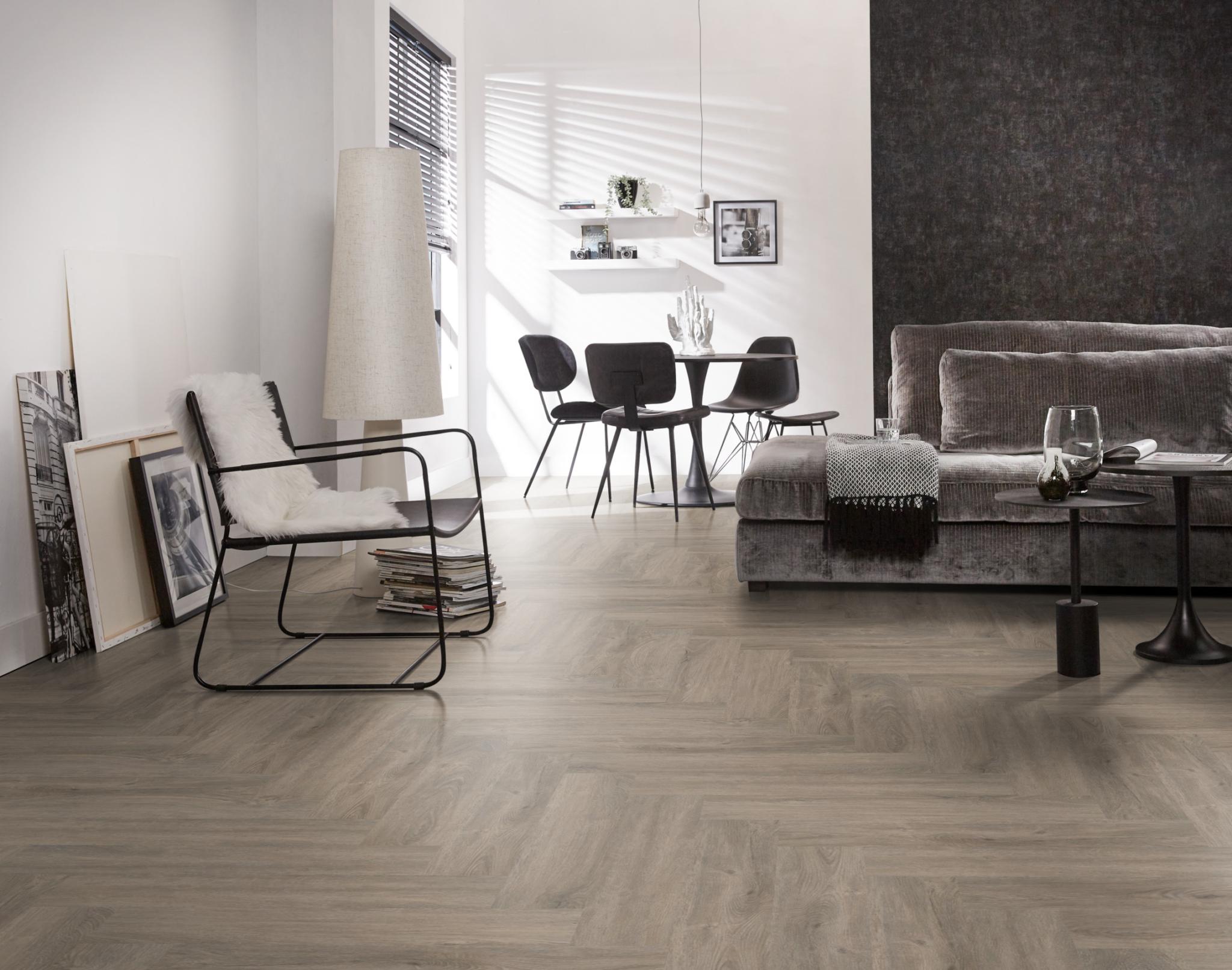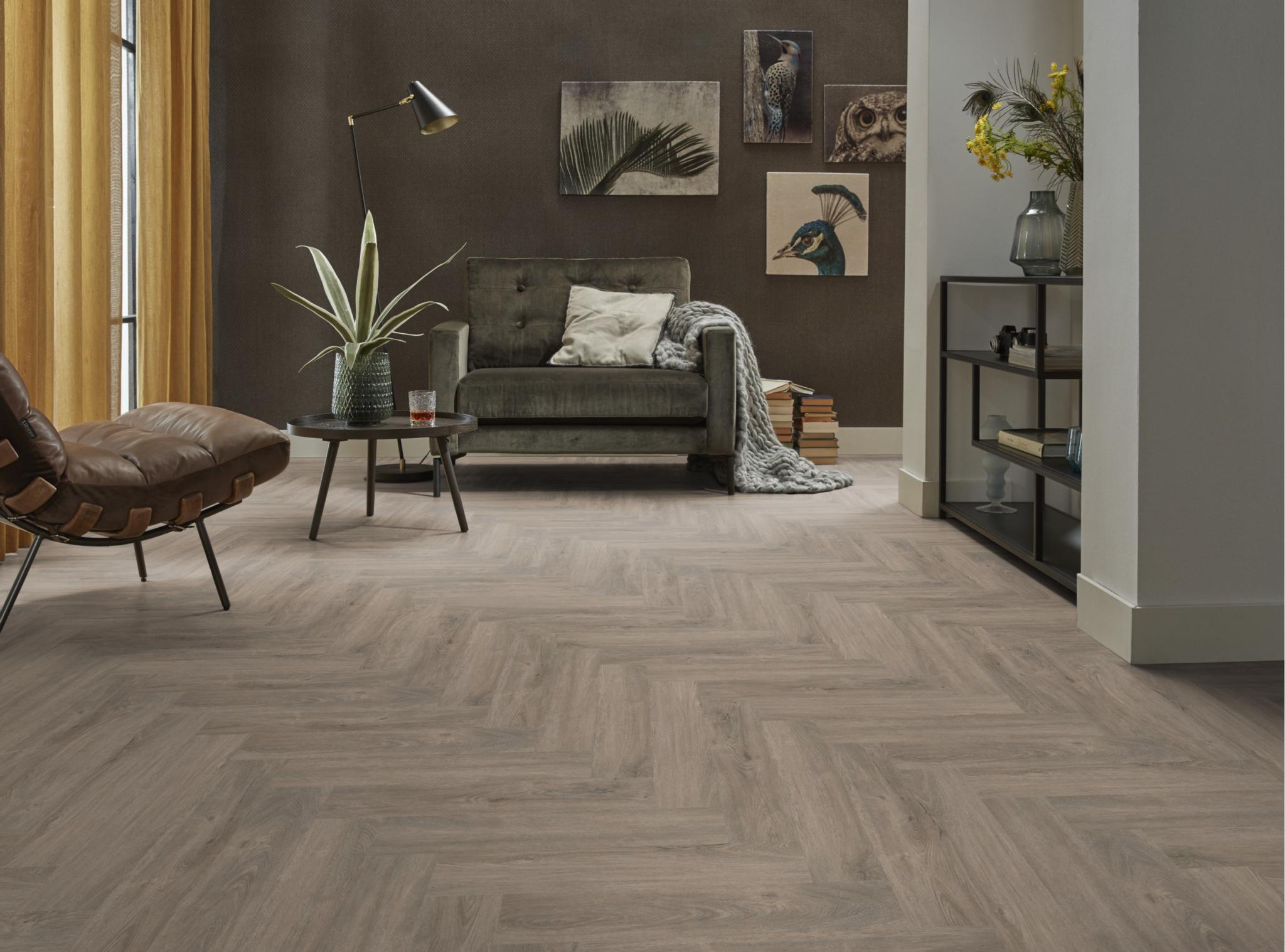 De moderne uitstraling van visgraat-pvc in karakteristieke uitvoering. Deze vloer is nauwelijks van echt hout te onderscheiden, door de kleine noesten. Deze vloer is 2,5mm dik en heeft een toplaag van 0.55mm.